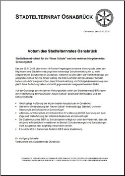 Das offizielle Votum des StER Osnabrück zur weiteren Entwicklung des Sek I - Bereichs baut auf den Auswertungsergebnissen dieses Meinungsbildes auf. Das Ergebnis der Meinungsbildabfrage und das Votum werden am 12.11.2015 im Schul- und Sportausschuss des Stadtrats Osnabrück vorgetragen.
