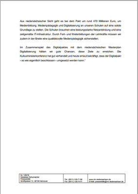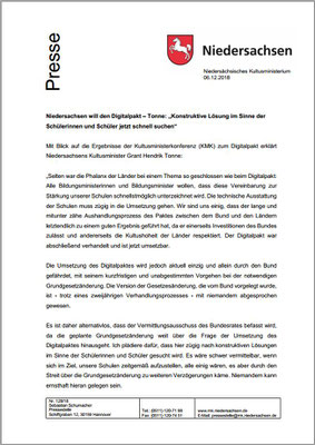 06.12.2018: "Niedersachsen will den Digitalpakt" Tonne: "Konstruktive Lösung im Sinne der Schülerinnen und Schüler jetzt schnell suchen"